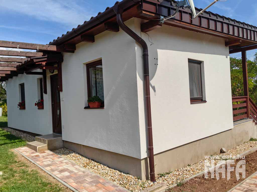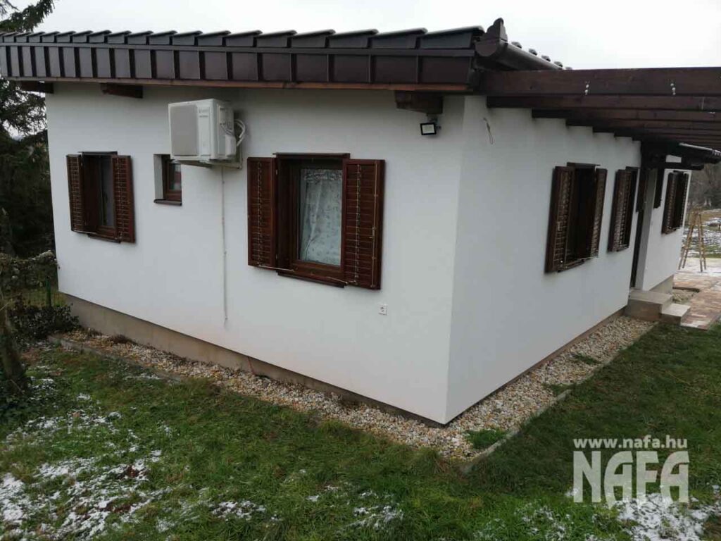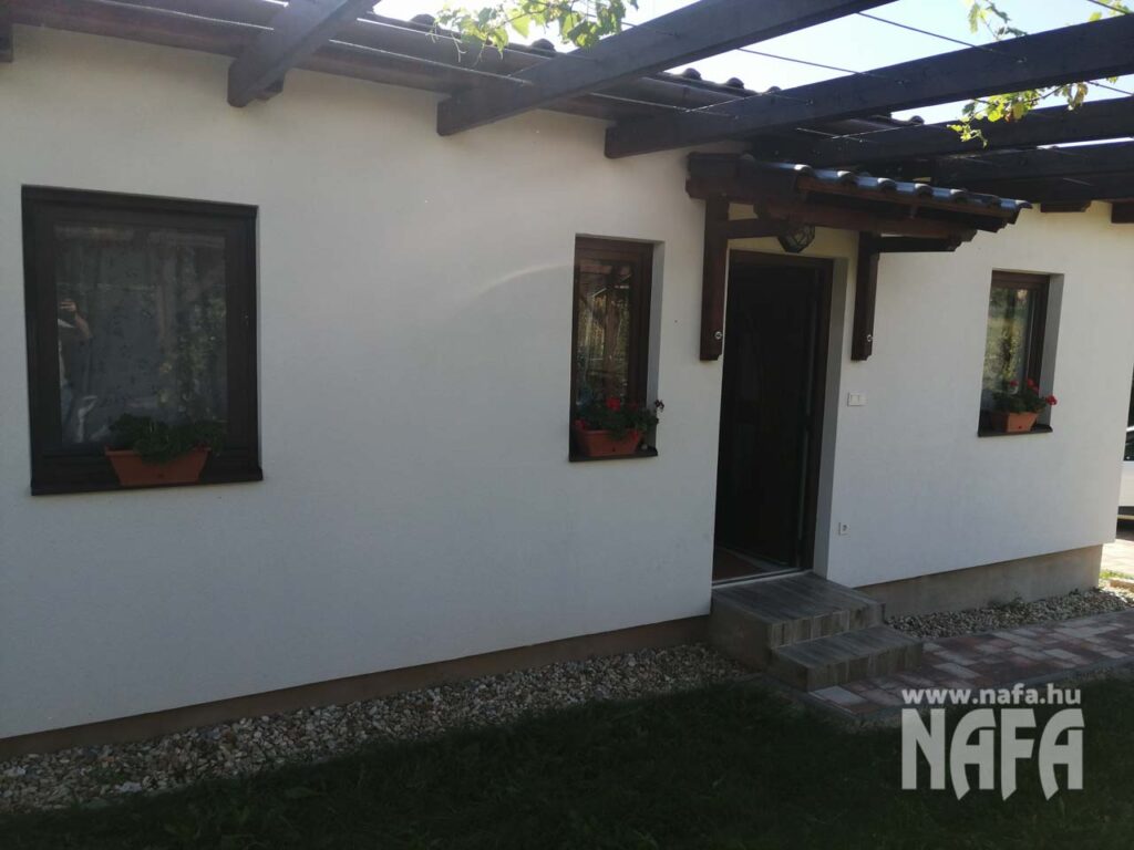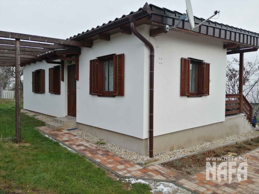 Új építésű, hétvégi használatra szánt nyaraló, letisztult modern dizájnnal, barna famintás műanyag ablakokkal.