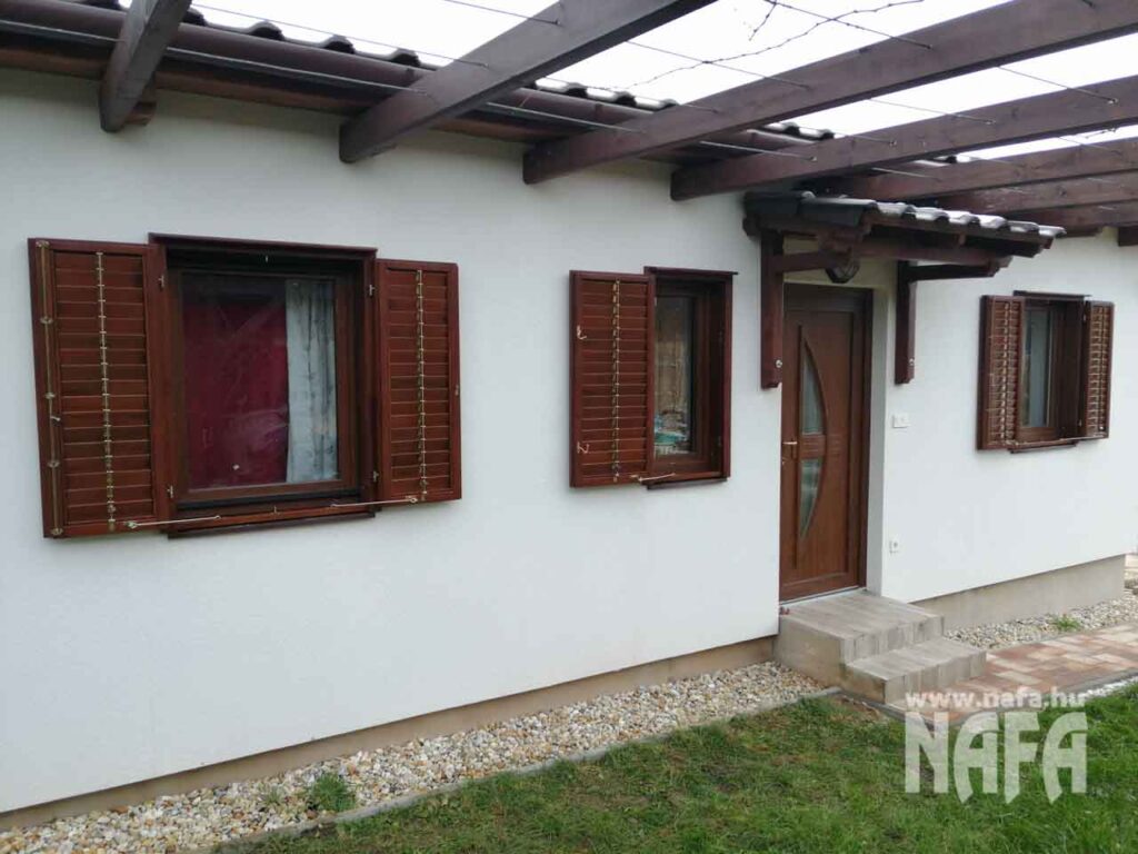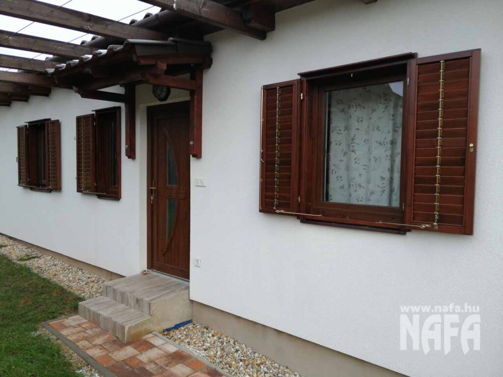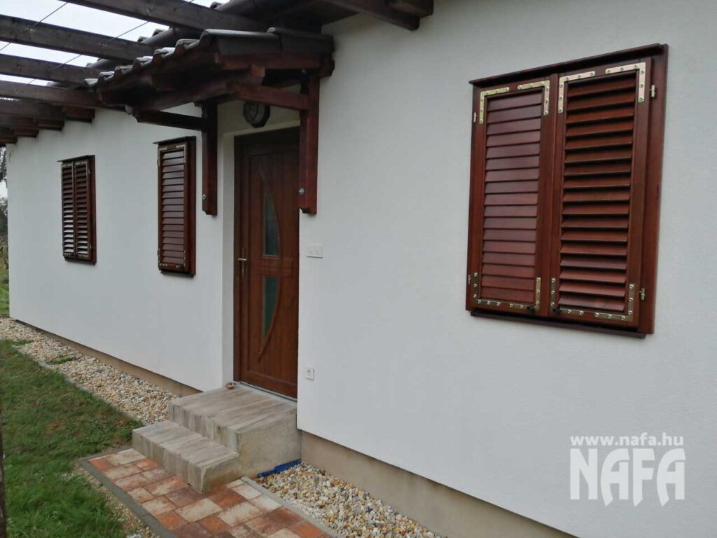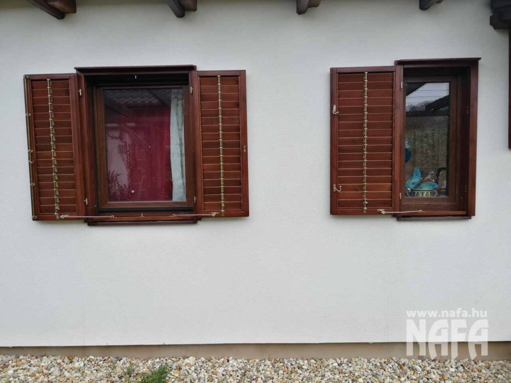 A zsalugáterek borovifenyőből készültek, sötétbarna, lazúr jellegű felületkezeléssel.