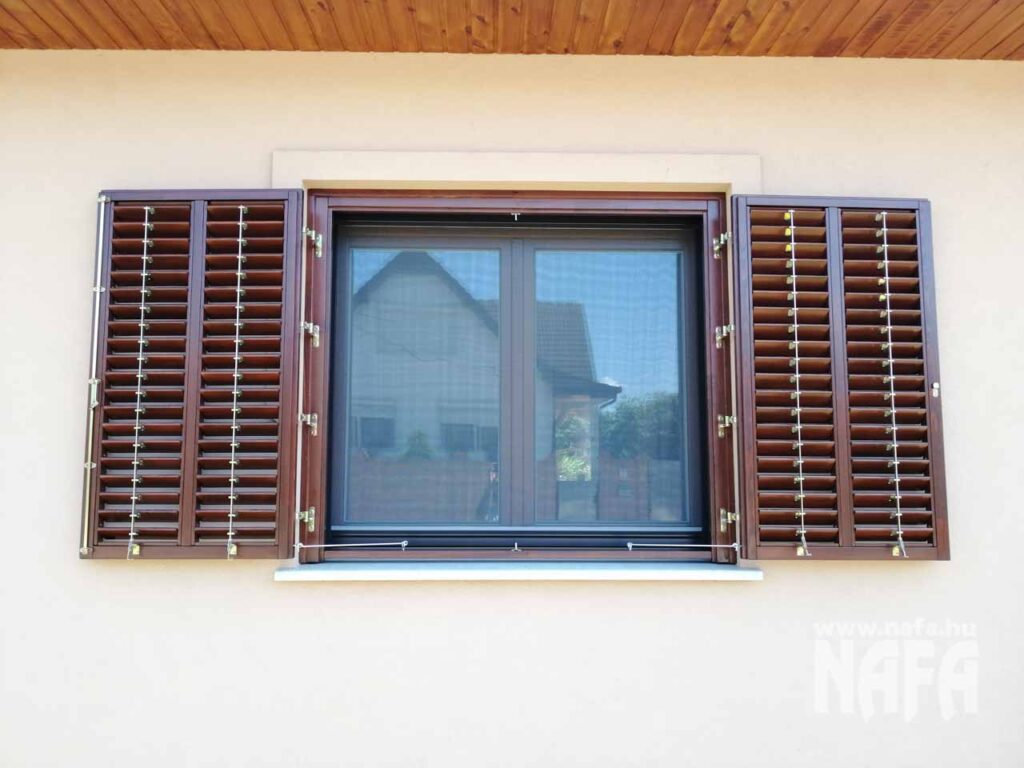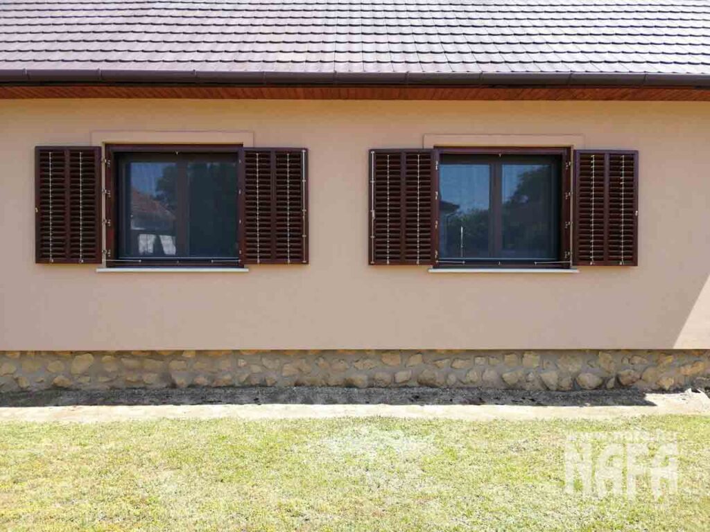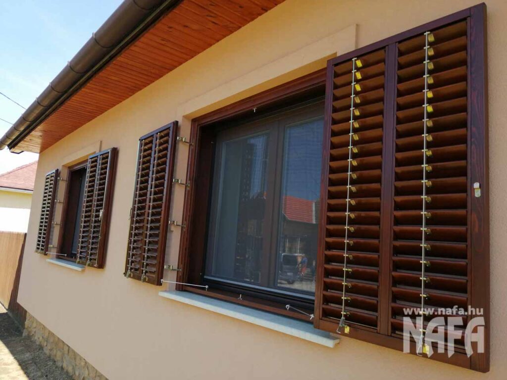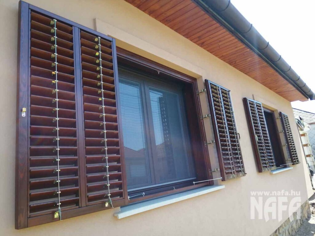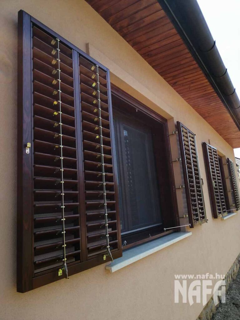 A zsalugáterek borovifenyőből készültek, dió színű, lazúros jellegű felületkezeléssel.